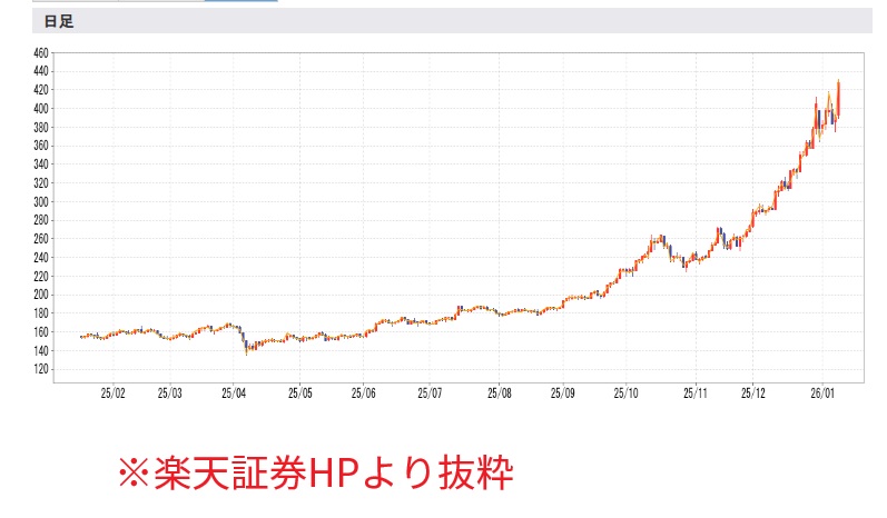 まず、1年前160円前後だったのが、本日(2026/01/13)430円前後となっています。+270円(+168%)と驚異的な伸びですが、これはほぼ投機で伸びています。