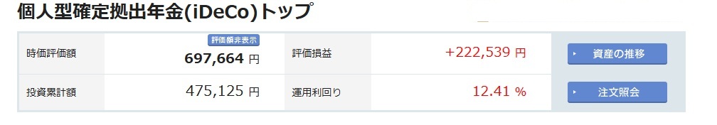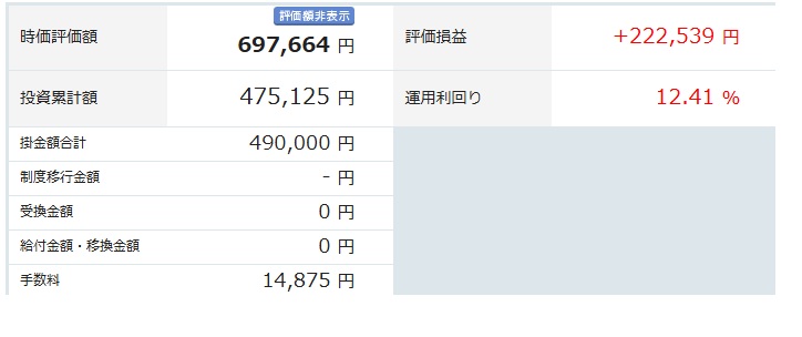 投資累計が475,125円に対し評価額が697,664円ということで差額222,539円がプラスとなっています。利回りは12.41%らしいですね。私は計算できないので表示を信じています。